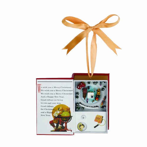 One wind-up Christmas Carol plays: 'We Wish You a Merry Christmas'..Miniature bound book is hand-stitched. Ribbon bookmark opens to reveal a miniature animated scene..Gift-boxed for the perfect gift!.Measures 3.75-Inches tall..Lyrics are printed inside for singing along!..