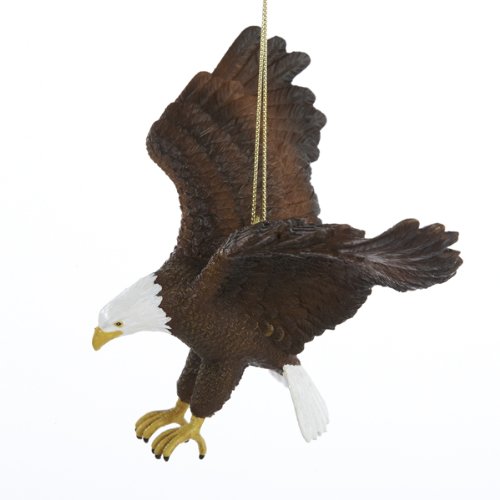 Made of 100% resin.Beautifully detailed.Measures approximately 4-inch. The Kurt Adler 4" Resin American Bald Eagle Ornament is a fun, unique way to add to your holiday décor! This swooping bald eagle ornament features many delicate details like intricate wings, sharply painted eyes, and yellow clawed feet.