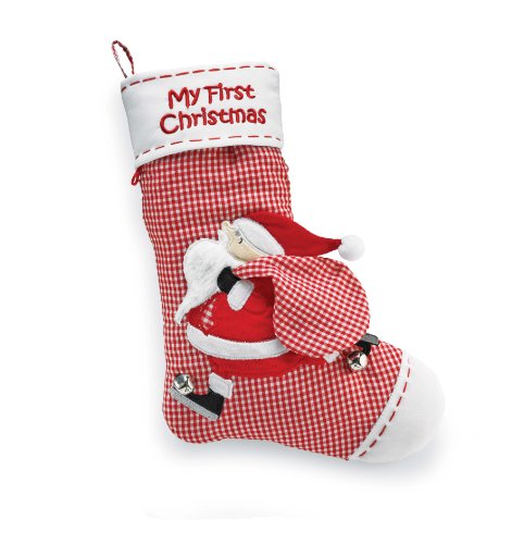 Red gingham stocking, Dimensional Santa applique, "My first Christmas" embroidered on the cuff, Jingle bell and faux fur accents..