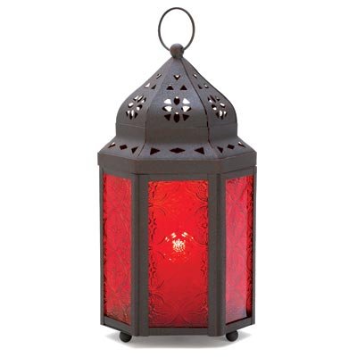 Exquisite metal cutwork with garnet red glass panels Fills any surrounding with a fascinating red glow Excellent decor item for festivities, parties and weddings Perfect as a decorative addition to any indoor or outdoor setting Striking Moroccan style glass and metal candle lantern