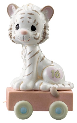 Packaged in a box made from recycled materials Precious Moments White tiger with number 16 on it sitting on train car figurine Infused with honest emotion it shares a message that speaks straight to the heart Indoor Use Only; Should Be Dusted Occasionally Each Piece Is Porcelain Bisque; Hand Sculpted and Hand Painted