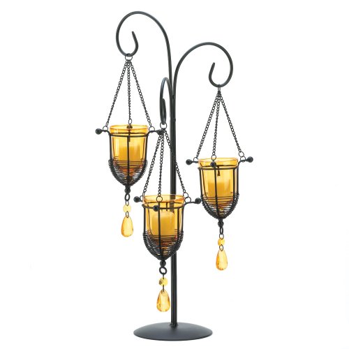 Great decorative centerpiece for weddings and parties Enlivens any setting with its spellbinding sunset glow Stunning triple candle stand crafted from Iron, glass with acrylic accents Matte black metal with golden-amber glass candle cups Elegant gift idea for friends and family