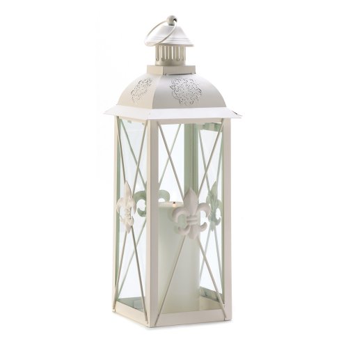 Beautiful white finish with fleur de lis accents Livens up the surroundings with a lit pillar candle placed inside Elegantly designed iron and glass candle lantern Great decorative centerpiece for weddings and parties Wonderful gift idea for your friends and family