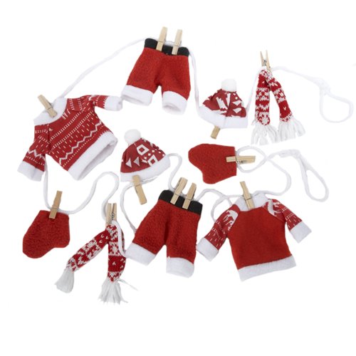 Measures over 6 feet long In festive red and white colors Features hanging hats, scarves, mittens, sweaters, and pants