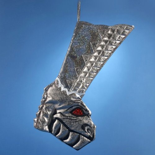 21-inch polyester stocking. This Kurt Adler 21-inch KISS Dragon Boot Printed Applique Stocking is a fun, unique way to add to the holiday decor of any KISS fan. Resembling the trademark KISS costume boots, this stocking features a dragon-like face at the foot, with glowing red eyes and large, rounded teeth. Going up the leg of the boot is a multi-colored glitter pattern, resembling the scales of a dragon.