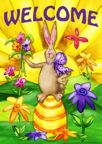 600 denier polyester. This Welcome Bunny Garden Flag will make a statement hanging from your front porch or in your garden this season. Featuring artwork by Karen Embry this flag has a festive bunny holding a bouquet of Easter flowers just for you. reading "Welcome" across the top this bunny will greet all your visitors from atop his big Easter egg. From the authority in House and Garden Flags, Toland Home Garden only offers flags of the finest quality. There is something for everyone in Toland's sought-after line of original decorative art flags.