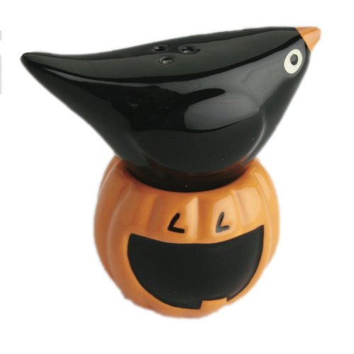Pieces stack on each other. Raven and Pumpkin figural salt and pepper set. Each piece features a pumpkin shaker which has a decorative raven that stacks on top. Crafted from earthenware, we recommend hand washing.