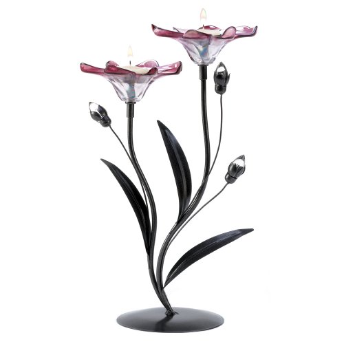 Elegant gift idea for friends and family. Two open flowers surround the tealight holders on this cute table lamp. Clear crystal flower buds adorn the stems while the full blooms extend to their claret color on the petals. Weight 1-pound. 8-inch by 4-1/2-inch by 12-1/2-inch high. Iron, glass and acrylic. Candles not included.