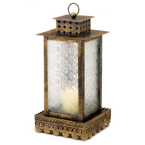 Ornate glass creates awesome lighting effect. Lacy filigree trim and ornate pressed glass panels are a striking counterpoint to the slender, squared shape of this elegant bronze-finish lantern. A glowing example of balance and form. Metal and glass. Candle not included. 5-1/4-Inch by 5-1/4-inch by 11-inch high.