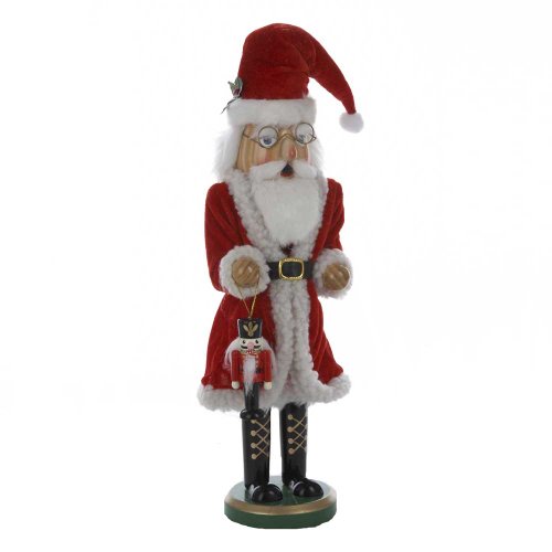 Stands at 15-inch in height. This Kurt Adler 15 Santa Nutcracker with Mini Hanging Nutcracker is a classic, traditional way to add to your holiday decor. This rosy-cheeked Santa peeks out from behind wire frame glasses and wears his classic red suit. In his right hand, a nutcracker solider hangs from a gold string.