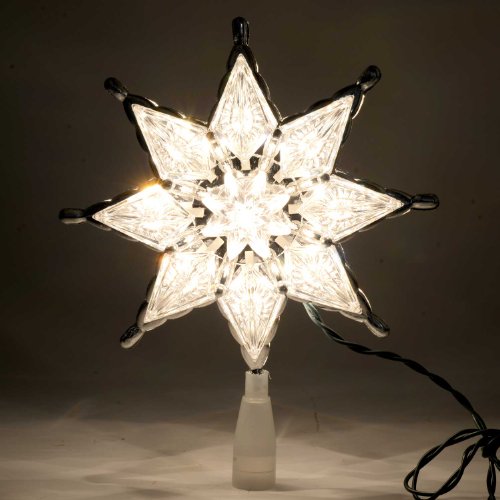 This 8-point silver star treetop is a unique, bright way to accent the lighting on your Christmas tree. This tree topper is a silver star framed with a clear star and 3-ply water lily in its center, outlined with blue lighting.