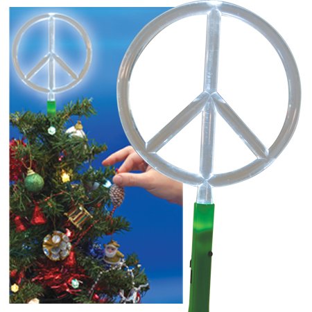 A switch at the base allows you to choose from flashing and non flashing modes. Top your holiday tree with this LED peace sign tree topper. A switch at the base allows you to choose from blinking and non blinking modes. Includes a 4-volt adapter with a 10-inch cord. Measures 13-1/2-inch tall and 7-inch wide.