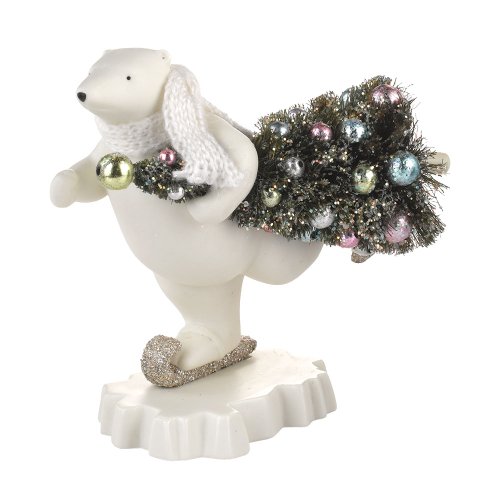 Intricately hand painted. Inspried by Snowbabies, Snow Dream brings a whimsical vintage style to the Holidays with antique silver glitter and a soft touches of colors. This bisque porcelain skating bear has a special delivery to make just in time for Christmas-a decorated sisal Christmas tree full of shiny ornaments and covered with glitter.