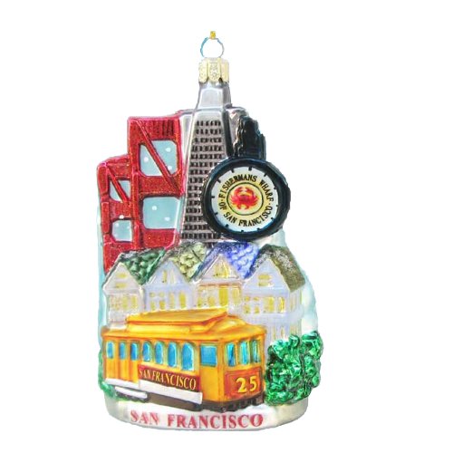 San Francisco. This beautiful glass cityscape ornament features San Francisco's famous landmarks including the Golden gate Bridge, the Painted Ladies and a cable car. This ornament is 5-inch tall.
