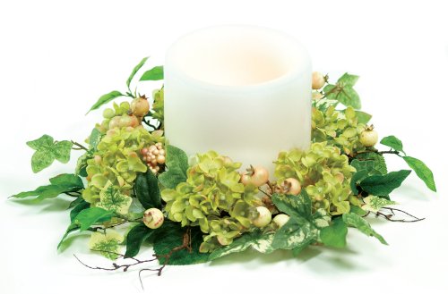 Use as a candle ring (fits a 6-inch candle) or as a small wreath. 13-Inch diameter soft green hydrangea candle ring with lush shades of green foliage, and yellow, cream berries. Basic shaping to full size is required.