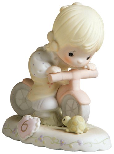 Precious Moments little girl first trying to ride a bicycle with the number 6 on a heart affixed to the base figurine. This addition to the Growing In Grace figurine series depicts a little girl learning to ride a bicycle. She stands 4.0 inches tall and is age six.
